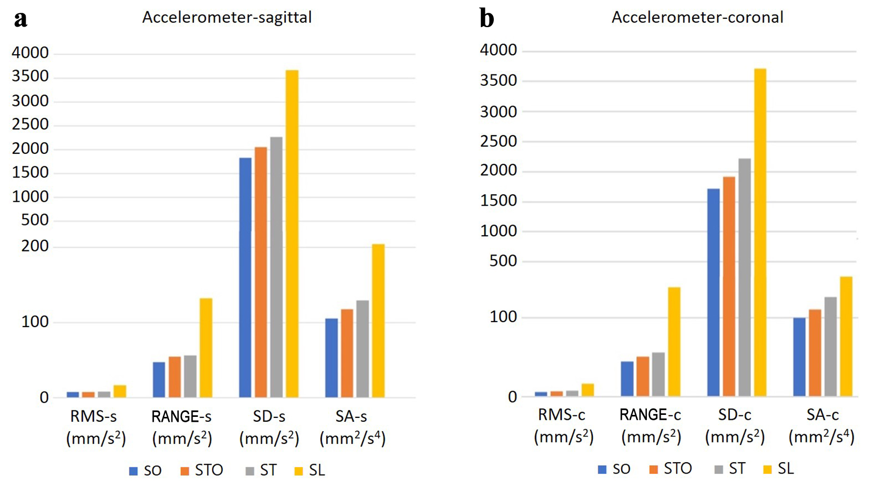 Similarly, the gyroscope-derived metrics for all four positions, using the RMS, RANGE, SA, and SD variables, are detailed in Table 3 and presented as bar graphs in Figure 3.