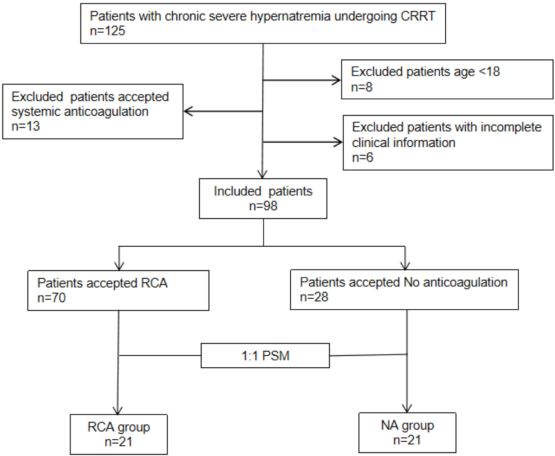 Medical records of patients aged 18 and older who were hospitalized to Henan Provincial People’s Hospital’s neurosurgery ICU between March 2020 to August 2024 and received CRRT for persistent severe hypernatremia with bleeding tendency were reviewed retrospectively. Inclusion criteria were those who received CRRT for persistent chronic severe hypernatremia, defined as a serum Na+ ≥ 160 mmol/L documented for a duration of > 48 h or with an unknown time of onset, consistent with the pathophysiological state of chronicity and associated brain adaptation [4]; who had bleeding risk (platelets < 10 × 109/L, activated partial thromboplastin time (aPTT) > 60 s, international normalized ratio (INR) > 2.0, active bleeding, recent surgery (≤ 7 days), or intracranial hemorrhage (≤ 3 months)) [11]. Exclusion criteria were missing critical data (e.g., blood gases), concurrent systemic anticoagulation. The patient’s financial situation will influence the attending physician’s choice of anticoagulation modality. To address potential confounding factors arising from this non-randomized allocation, we performed 1:1 propensity score matching (PSM) to create balanced groups for comparison. The clinician determined the patient’s anticoagulation modality, and patients were separated into RCA group and NA group. This retrospective study was approved by the Ethics Committee of People’s Hospital of Zhengzhou University (approval no. 2023-0145), and performed in accordance with the Declaration of Helsinki and waived the need for informed consent because of the retrospective study design.