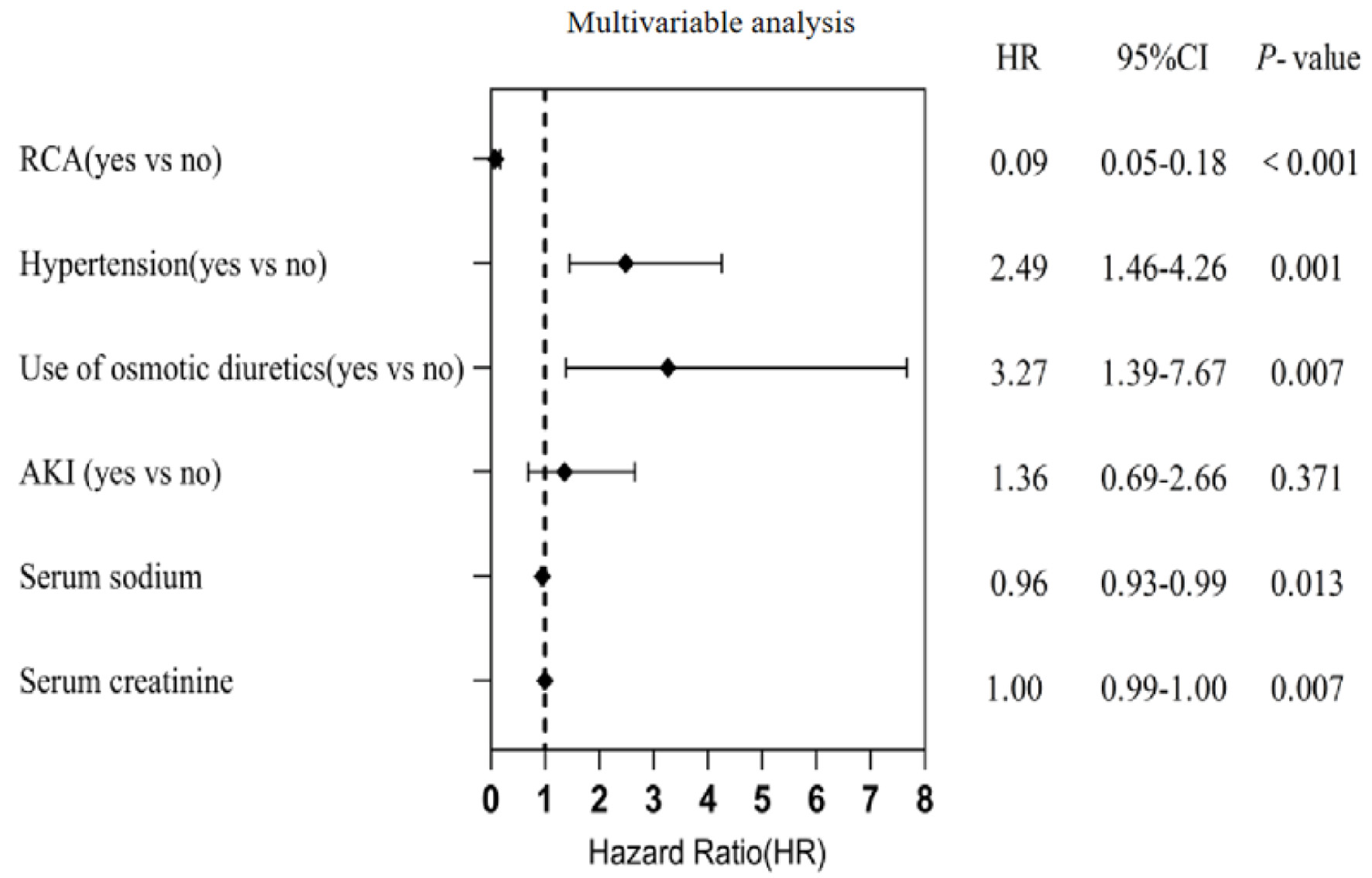 Results: Both groups achieved similar sodium correction rates (0.5 ± 0.1 mmol/L/h). The RCA group had a lower incidence of both hemorrhagic (6/70 (8.6%) and 8/28 (28.6%), P = 0.021) and filter coagulation (0/70 (0%) and 17/28 (60.7%), P < 0.001) adverse events. After performing Kaplan-Meier curve and multivariable Cox regression, RCA was identified as an independent protective factor for first filter lifespan (hazard ratio (HR) = 0.09, 95% confidence interval (CI), 0.05–0.18).