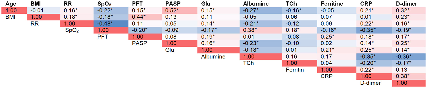 Correlation analysis was performed to identify the relationship between PFT volume and markers of systemic inflammation and metabolic disorders (Fig. 1). Significant positive correlations were obtained between PFT volume and age, markers of inflammation (CRP, D-dimer, ferritin), and metabolic parameters (BMI and blood glucose); a negative correlation was observed between PFT volume and SpO2.