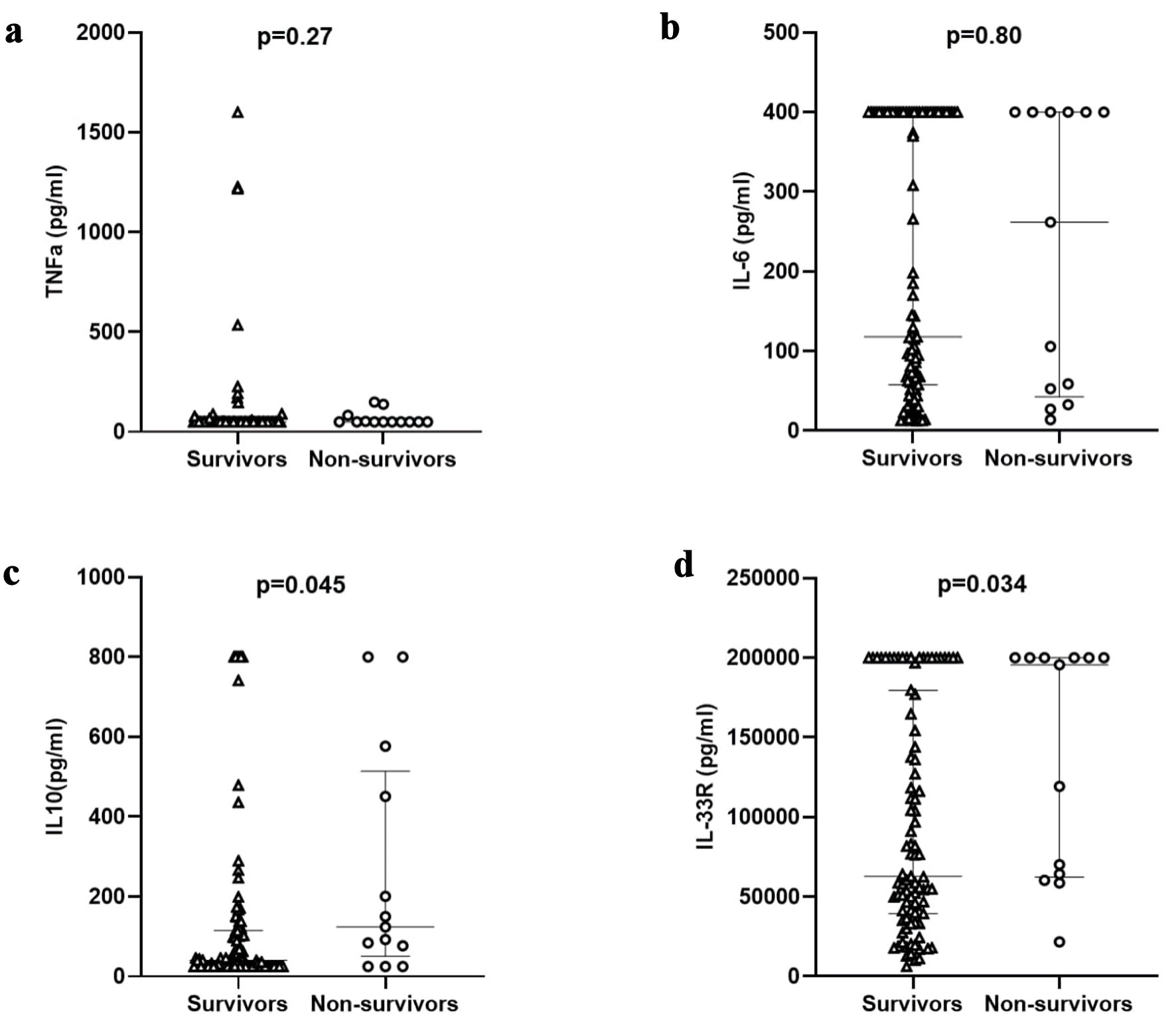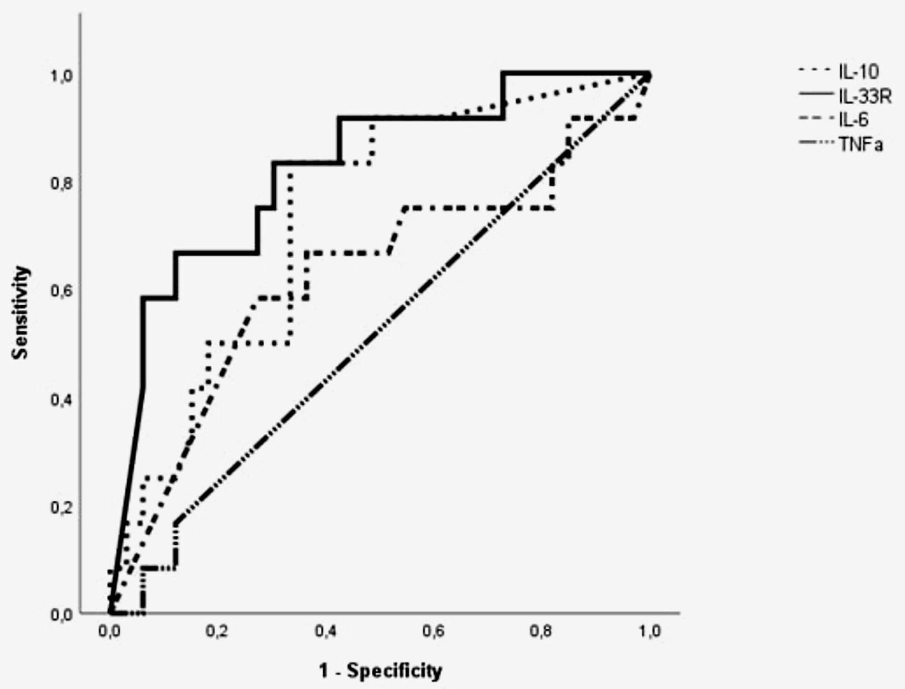 ![]() Click for large image | Figure 2. Cytokine differences regarding early outcome (in 72 h) in study population. TNF: tumor necrosis factor; IL: interleukin; IL-33R: interleukin-33 receptor. |