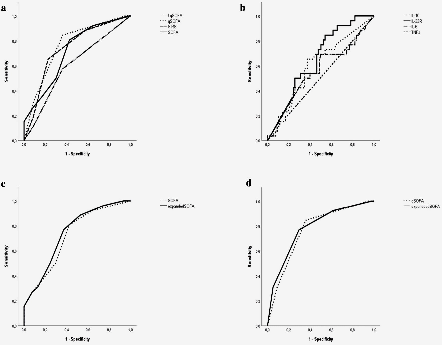 Results: SOFA, qSOFA, LqSOFA scores were significantly lower in sepsis survivors. IL-33R levels were significantly higher in non-survivors (P = 0.021). The best predictive score for sepsis based on the area under the receiver operating characteristic (ROC) curve was qSOFA (0.764, 95% confidence interval (CI) = 0.663 - 0.866), followed by LqSOFA (0.738, 95% CI = 0.63 - 0.845), SOFA (0.713, 95% CI = 0.604 - 0.822) and SIRS (0.603, 95% CI = 0.478 - 0.729). The addition of IL-33R levels (cut-off values > 55,393 pg/mL) to qSOFA and SOFA significantly increased the diagnostic accuracy of both scores with area under the curve (AUC) of 0.78 (95% CI = 0.695 - 0.85) and 0.740 (95% CI = 0.636 - 0.844), respectively. When evaluating early (within 72 h) in-hospital mortality, both IL-10 and IL-33R were significantly higher in non-survivors (124 pg/mL vs. 41 pg/mL in survivors, 195,610 pg/mL vs. 62,767 pg/mL in survivors, respectively). When added to qSOFA and SOFA scores (cut-off levels 74.5 pg/mL and 55,393 pg/mL for IL-10 and IL-33R, respectively), they significantly increased their diagnostic accuracy.