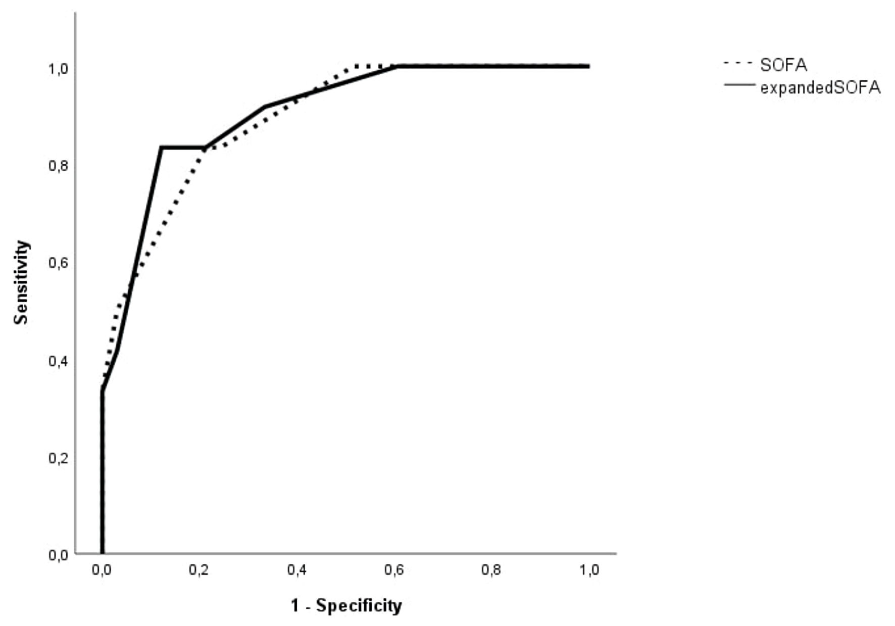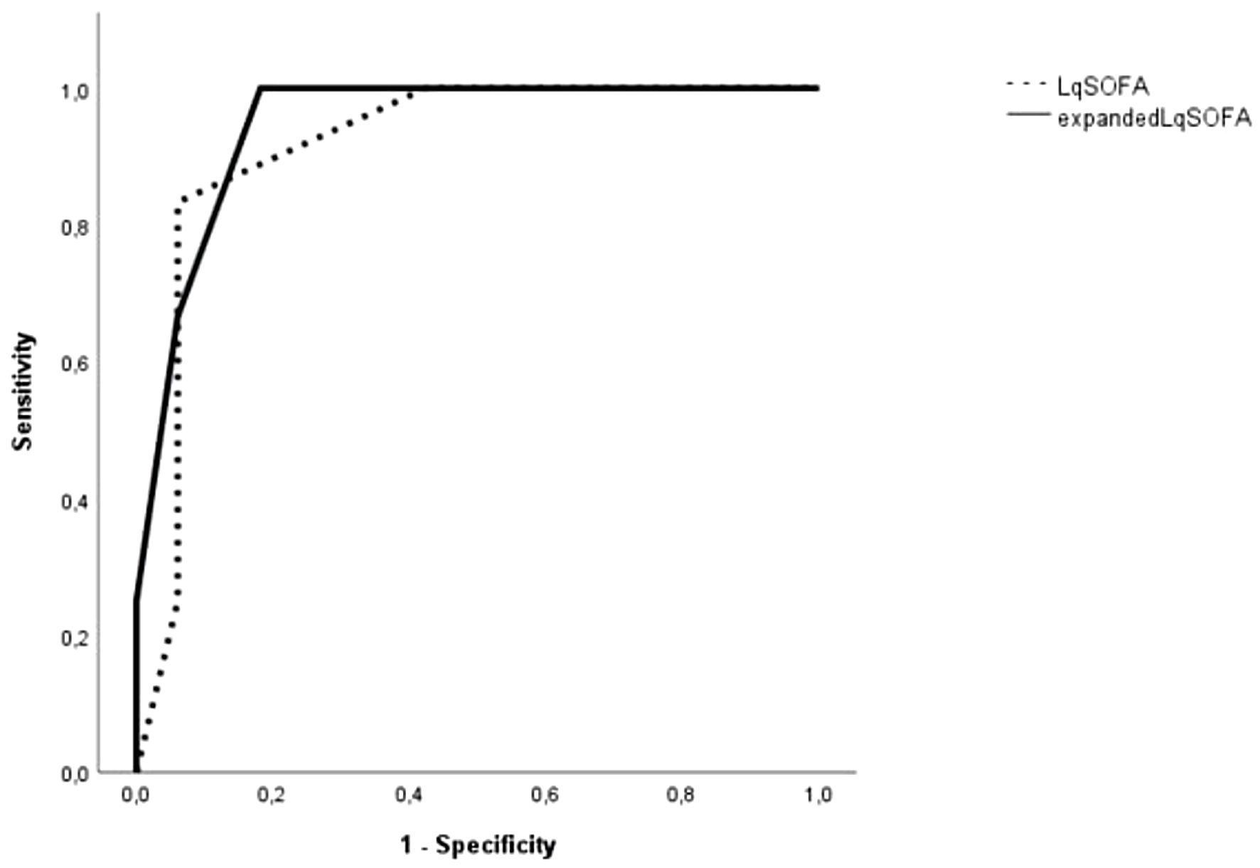 We evaluated the performance of several commonly used severity scores in predicting in-hospital mortality in sepsis patients. SOFA, qSOFA and LqSOFA were all significant predictors of in-hospital mortality whereas SIRS failed to predict in-hospital mortality, which aligns with previous studies indicating its limited utility in sepsis risk stratification. The best predictive score was qSOFA, followed by LqSOFA and SOFA using ROC analysis, with qSOFA having greater sensitivity (84.6% for qSOFA > 1 in comparison to 81% for SOFA > 3), although for qSOFA values > 2 sensitivity drops to about 31% underscoring the score’s limited ability to capture all at-risk patients, particularly those in early stages of sepsis or with non-severe manifestations. This is in accordance with a retrospective validation of the Sepsis-3 definitions, which raises concerns about the prognostic value of qSOFA for sepsis patients outside ICU due to its poor sensitivity [11]. The Third International Consensus for Sepsis and Septic Shock added qSOFA as a useful tool for early discrimination of patients with sepsis requiring more intensive care using only clinical criteria, making it an important adjunct for resource low settings [4, 9]. However, many patients, especially young, did not meet the threshold of two points in qSOFA scale and failed to be classified as septic, wasting an important amount of time in sepsis treatment, which led to abandonment of qSOFA in 2021 Sepsis Guidelines as a single diagnostic sepsis score and favored other scores such as SOFA or NEWS [12]. To overcome low sensitivity, there were studies combining lactate point-of-care values with qSOFA to enhance bedside mortality prediction. A prospective cohort study in southeast Asia concluded that combination identified patients at risk for sepsis-related mortality with better accuracy than qSOFA alone and with similar accuracy as SOFA score [10]. That has been also confirmed by a systematic review, which included 11 studies - most of which indicated an increase in the area under the receiver operating characteristic (AUROC) curve for qSOFA with the addition of lactate mainly in the emergency department [13]. In contrast, in our study, combination of binary lactate (> 2 mmol) values with qSOFA did not lead to better predicting ability than qSOFA alone, although it was an adequate predictor of mortality with higher values in non-survivors.