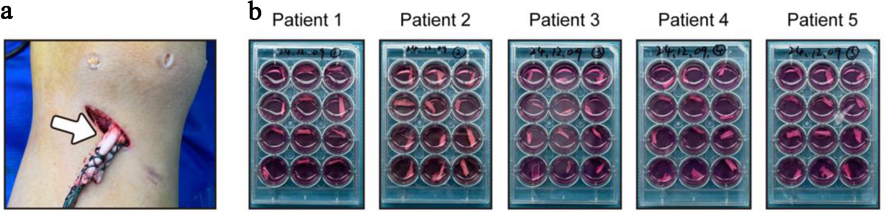 Firstly, we collected the redundant tendon tissues from five male patients aged 24 - 46 who underwent anterior cruciate ligament reconstruction on the same day (Fig. 1a). Regarding that the potential influences of obesity, inflammation, nutrition, and metabolites, we analyzed their baseline data. The results showed that their BMI, white blood cell count, platelet count, hemoglobin level, albumin level, creatinine level, and uric acid level were basically within the normal range (Table 1). Each tendon tissue was immediately divided into 12 equal parts, and the loadless tendon explants were cultured in vitro as previously reported (Fig. 1b). To dynamically evaluate the macroscopic morphological changes of the tendon explants, we obtained images every 3 days within 15 days of the culture, so as to compare the macroscopic changes. The results showed that the tendon explants from all five patients exhibited spontaneous disintegration: as the culture time prolonged, the volume of the tendons gradually decreased, the surface became loose, and the tendon fiber bundles separated (Fig. 2).