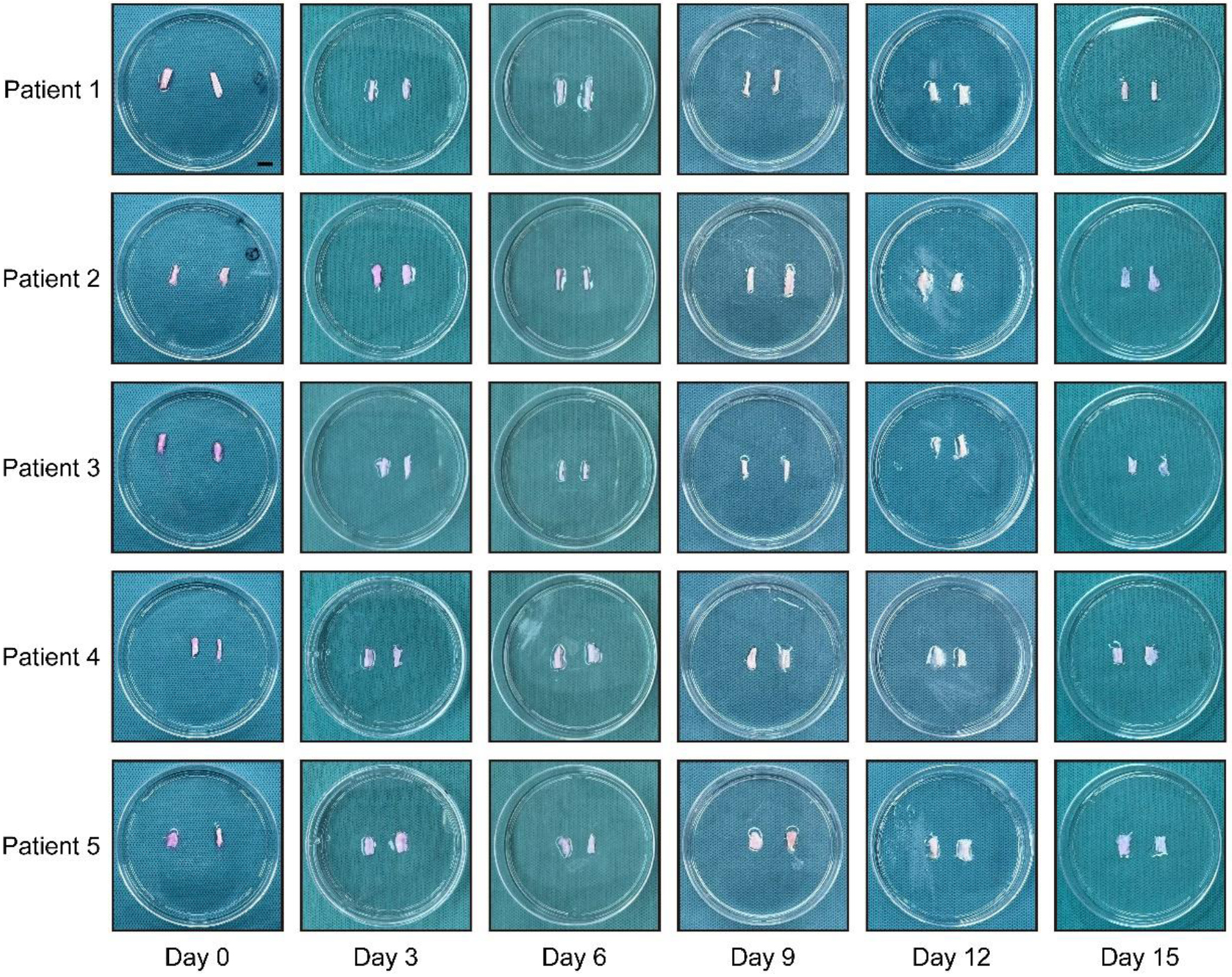 We performed sampling and recording on day 0/3/6/9/12/15. At each time point, two samples were collected from each patient. Each sample was washed three times with double-distilled water to remove surface impurities. Photographs were taken at different time points.