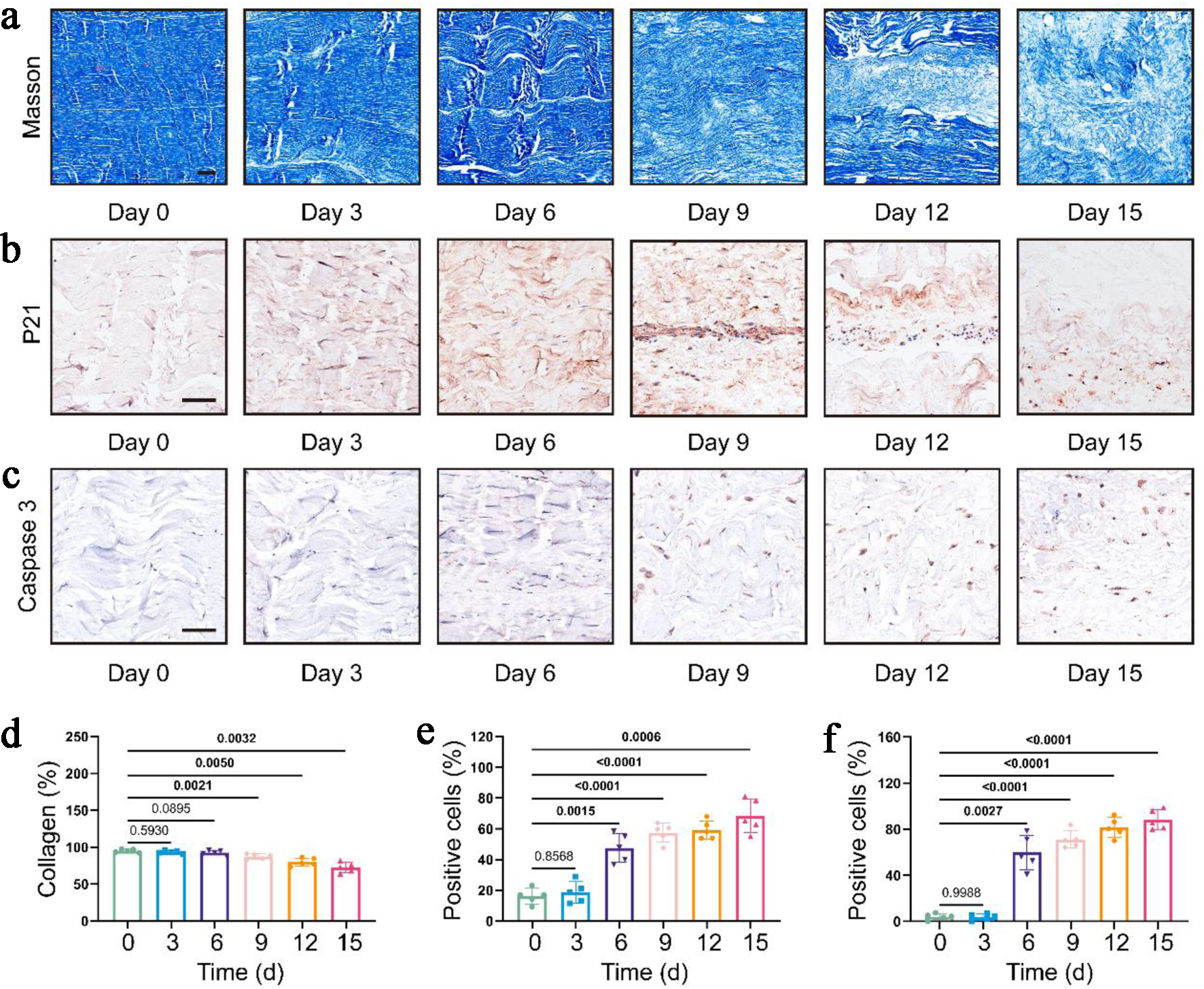 Next, to evaluate the cell status of the tendon explants at various time points, we performed immunohistochemical staining for the senescence marker P21 and the apoptosis marker Caspase 3. The results showed that the number of positive cells for both markers increased significantly starting from day 6 (Fig. 3b, c). Quantitative analysis revealed that compared with day 0, the positive cell rate of P21 increased significantly from 15% to approximately 50%, and it was approximately 70% on day 15 (Fig. 3e). Similarly, the positive cell rate of Caspase 3 increased significantly from 5% to approximately 60%, and it was approximately 90% on day 15 (Fig. 3f).