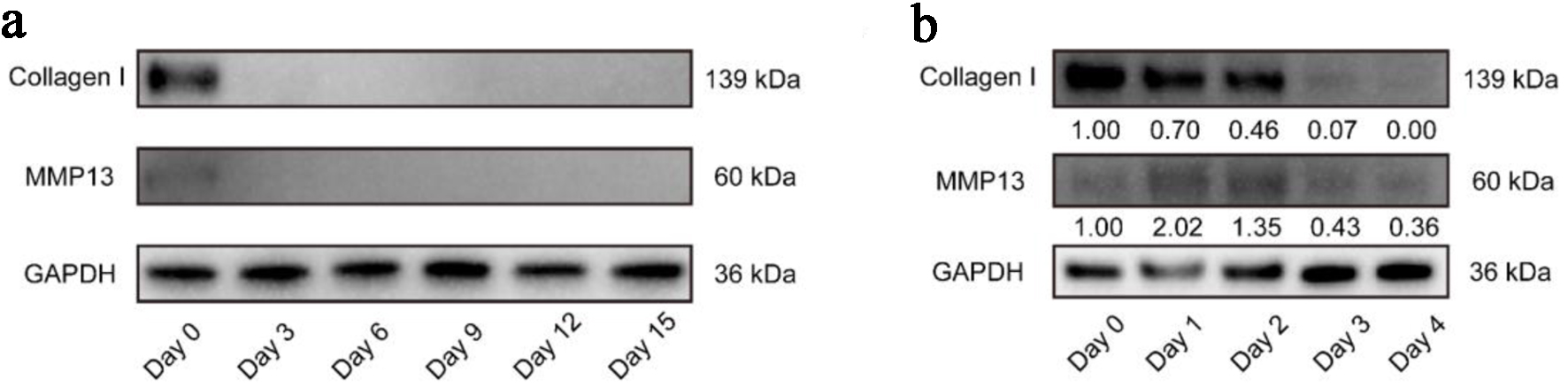 Collagen I is the main structural component of the extracellular matrix of tendons, which significantly affects the stability of tendon tissues [13]. Its content usually accounts for more than 90% of the tissue [14]. To evaluate the compositional changes of tendon explants at various time points, we performed Western blot for it. The results showed that on day 0, Collagen I was highly expressed in the tendon tissues. However, its level decreased significantly on day 3 and could barely be detected at following time points (Fig. 4a). In addition, normal tendon tissues contain some MMP 13 to maintain tissue renewal, while the content increases under pathological conditions [15]. The results showed low-level MMP 13 expression on day 0 and day 3, and it could no longer be detected from day 6 to day 15 (Fig. 4a). To elucidate their change pattern within the first few days, we harvested tendons from another three patients to carry out analysis daily. Consistently, Collagen I decreased gradually, especially from day 2 to day 3. Meanwhile, MMP 13 increased within 2 days but decreased dramatically since day 2 (Fig. 4b).