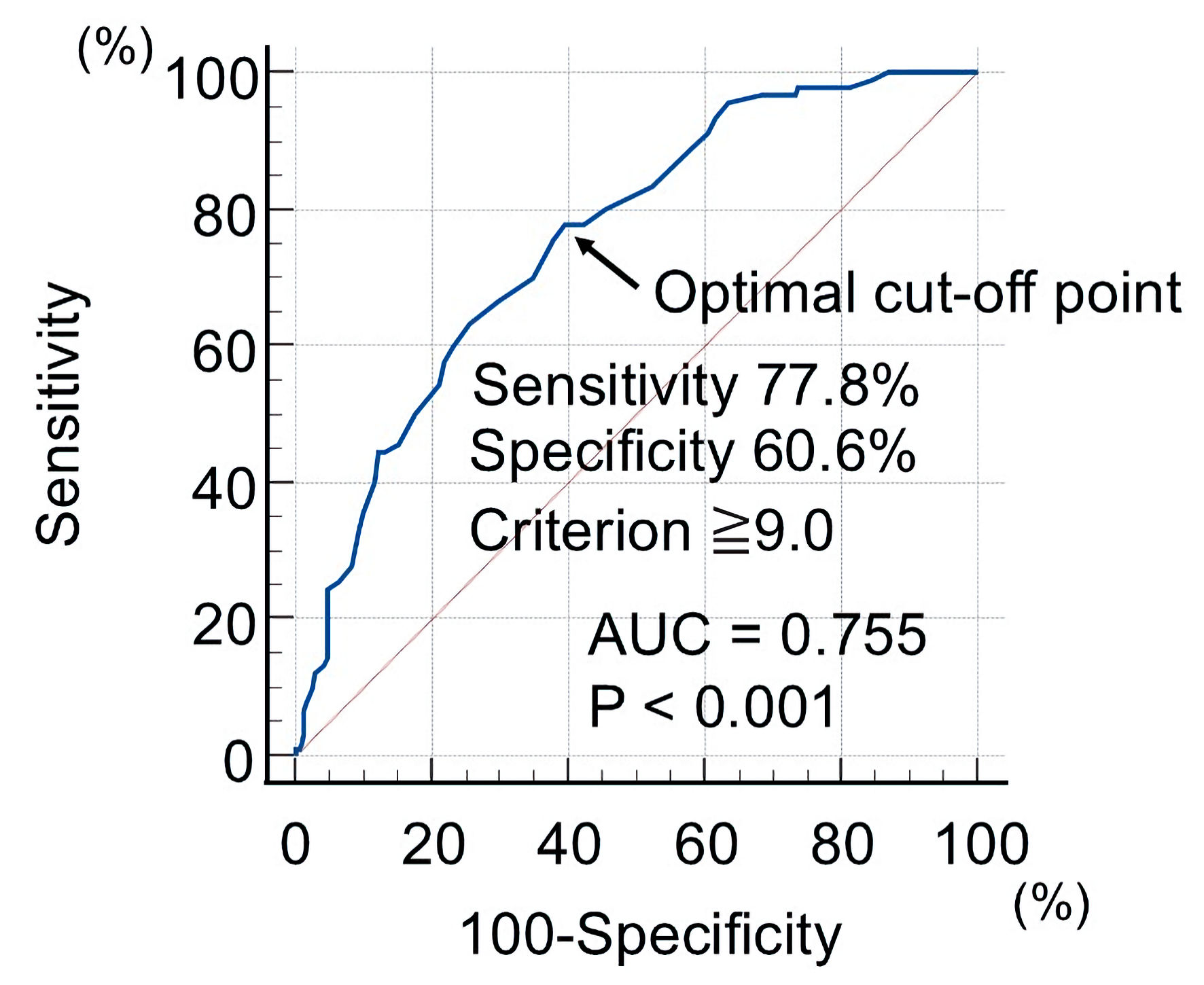 ![]() Click for large image | Figure 1. Optimal cut-off value of CAVI to detect primary CVD events using receiver operating characteristic curve analysis. The patients were divided into two groups based on the optimal cut-off value of the CAVI (cut-off value: 9.0): high CAVI group (group H) and a low CAVI group (group L). CAVI: cardio-ankle vascular index; CVD: cardiovascular disease; AUC: area under the curve. |
