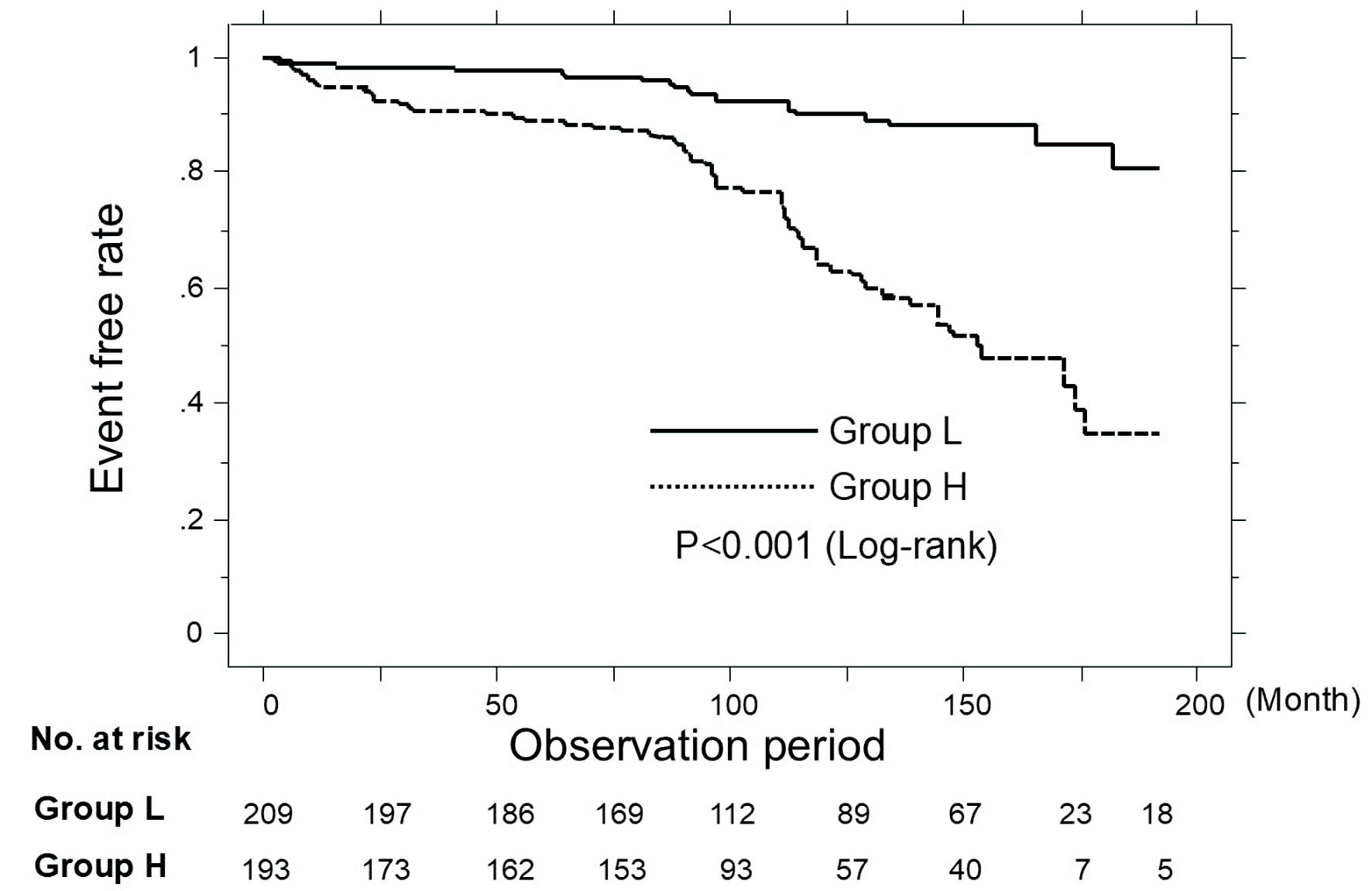 Figure 2 shows the results of the Kaplan-Meier curve analysis of all patients who participated in this study regarding the occurrence of primary CVD events. The median observation period was 100 months (range: 2 - 192 months). During the observation period, 90 patients experienced primary CVD events (group L, n = 20 (9.6%), vs. group H, n = 70 (36.3%)). Thus, group H had a significantly higher incidence of primary CVD events than group L (P < 0.001, log-rank test).