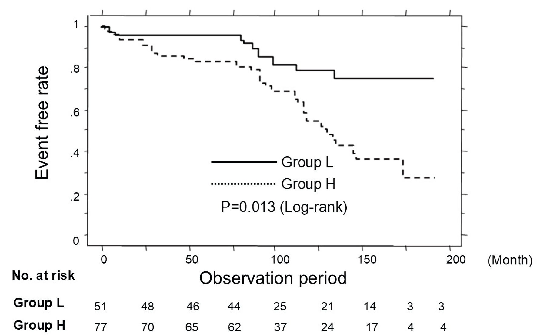 Figure 3 shows the results of the Kaplan-Meier curve analysis in patients not using RAS inhibitor and statin regarding the occurrence of primary CVD events. During the observation period, 47 patients experienced primary CVD events (group L, n = 9 (17.6%), vs. group H, n = 38 (49.4%)). Thus, group H had a significantly higher incidence of primary CVD events than group L (P =0.013, log-rank test).