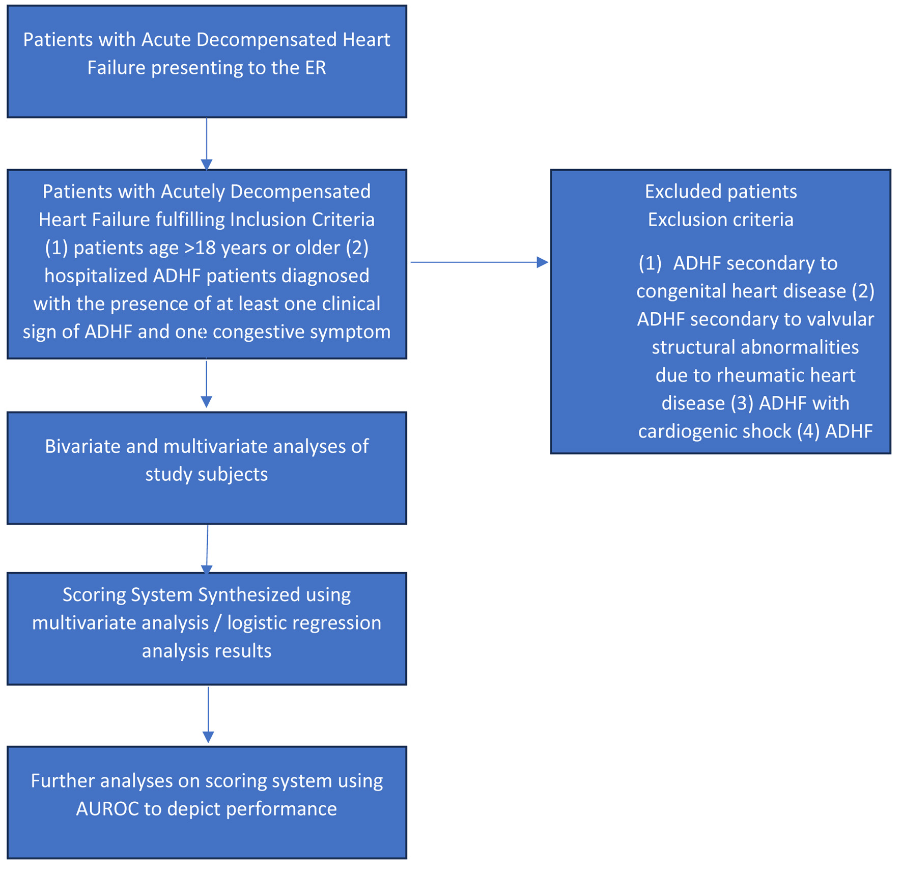 DM, history of IV loop diuretic, daily loop diuretic dosage, LVEF < 49%, BUN > 21 mg/dL, and serum chloride < 98 mmol/L were found to be statistically significant in association with the occurrence of diuretic resistance using multivariate analysis. Based on these findings, a new scoring system with a fair performance could predict diuretic resistance among patients hospitalized with ADHF.