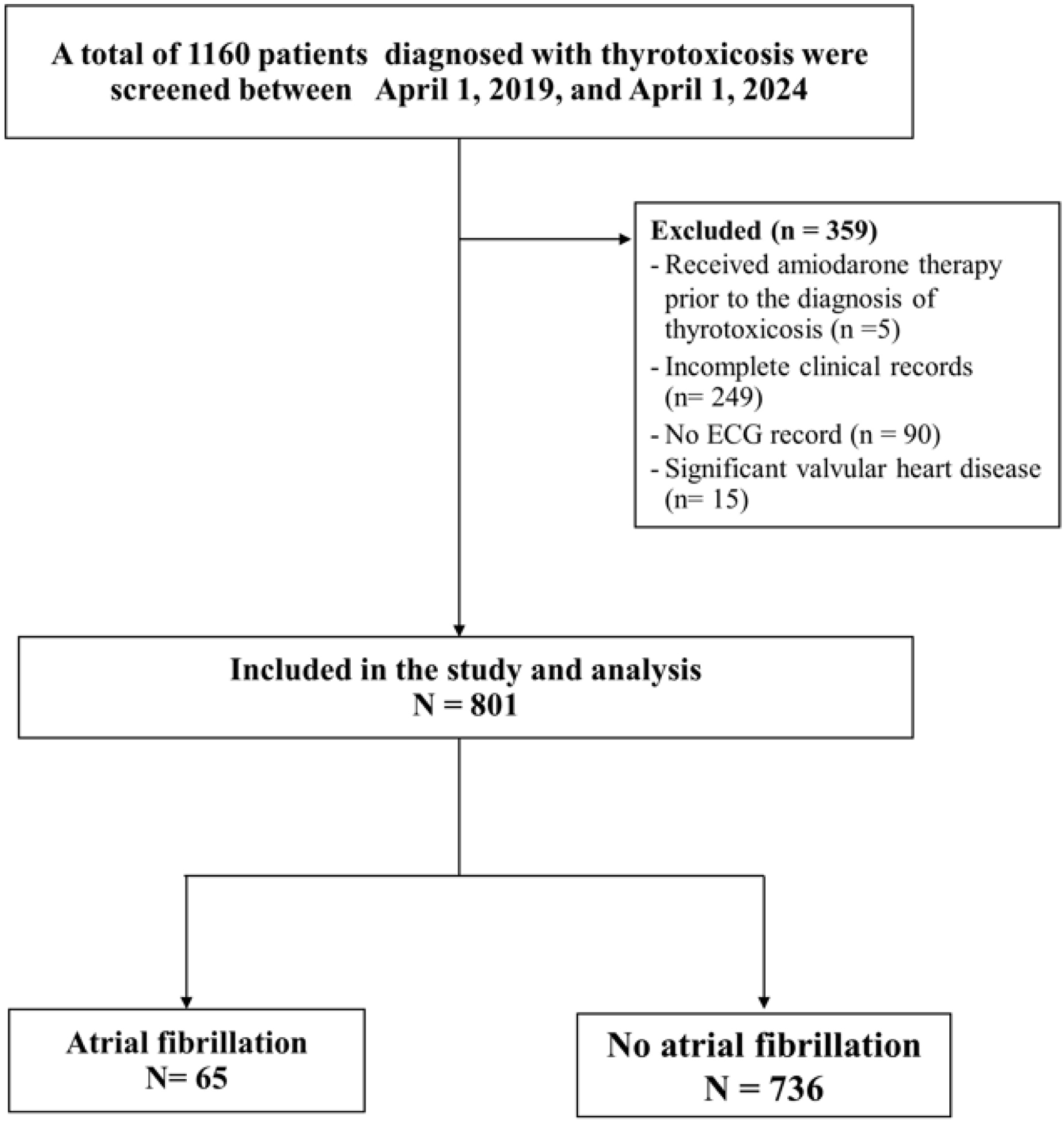 ![]() Click for large image | Figure 1. Flow diagram of patient selection. A total of 1,160 patients with thyrotoxicosis were screened, exceeding the minimum required sample size, and 801 were included in the final analysis. |