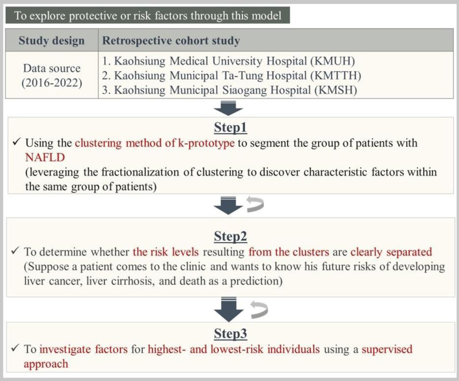In this study, step 1 used the k-prototype algorithm, an unsupervised machine learning method, to define distinct patient clusters. NAFLD patients from the KMUHRD database were screened between January 1, 2017, and December 31, 2021, and those meeting eligibility criteria were included. After confirming the eligible population, cluster analysis was performed. A brief overview of the step 1 design is shown in Supplementary Material 1 (jocmr.elmerjournals.com).