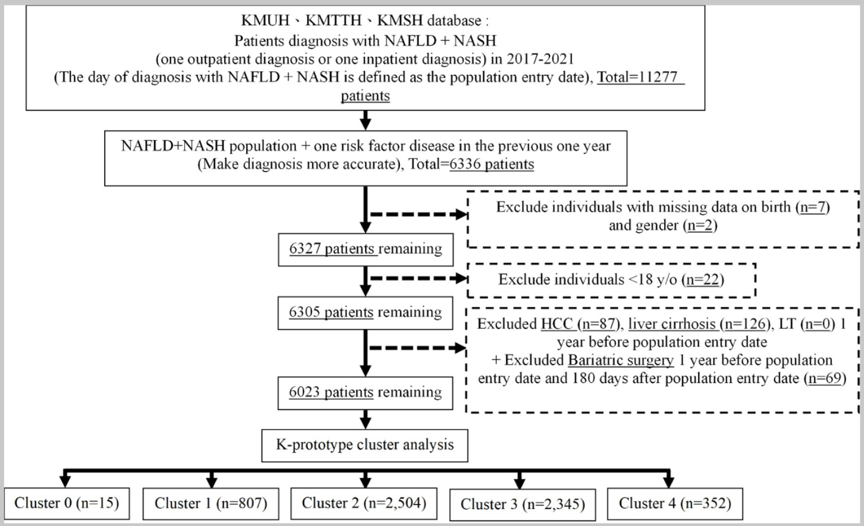 In step 1, the initial population comprised 6,023 patients. After excluding those with liver cirrhosis (n = 33), HCC (n = 15), LT (n = 0), who died (n = 1), who underwent bariatric surgery (n = 5), cluster 0 (n = 9), and those with a population entry date after December 31, 2020 (n = 972), the remaining population in step 2 was 4,988 patients.