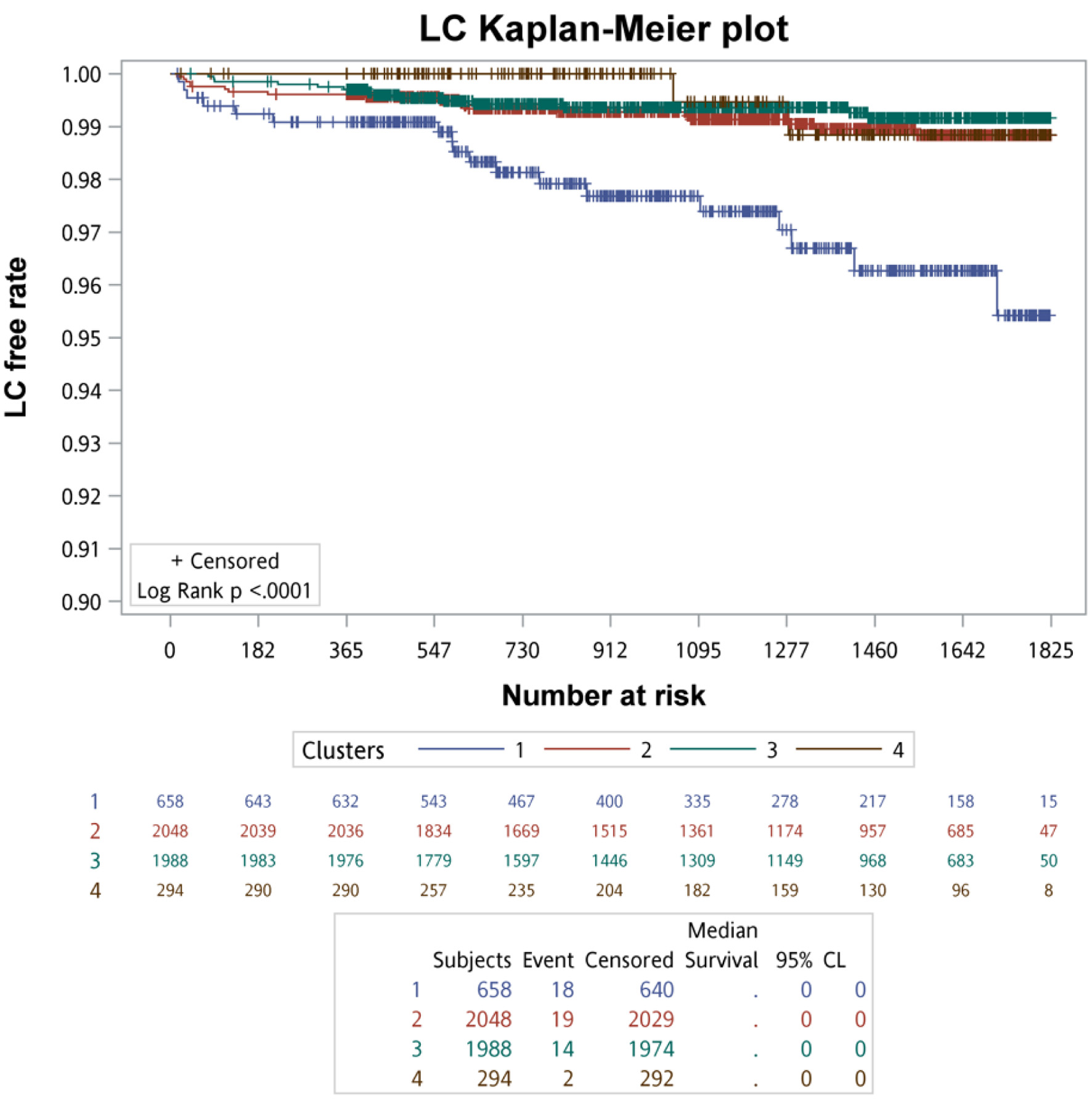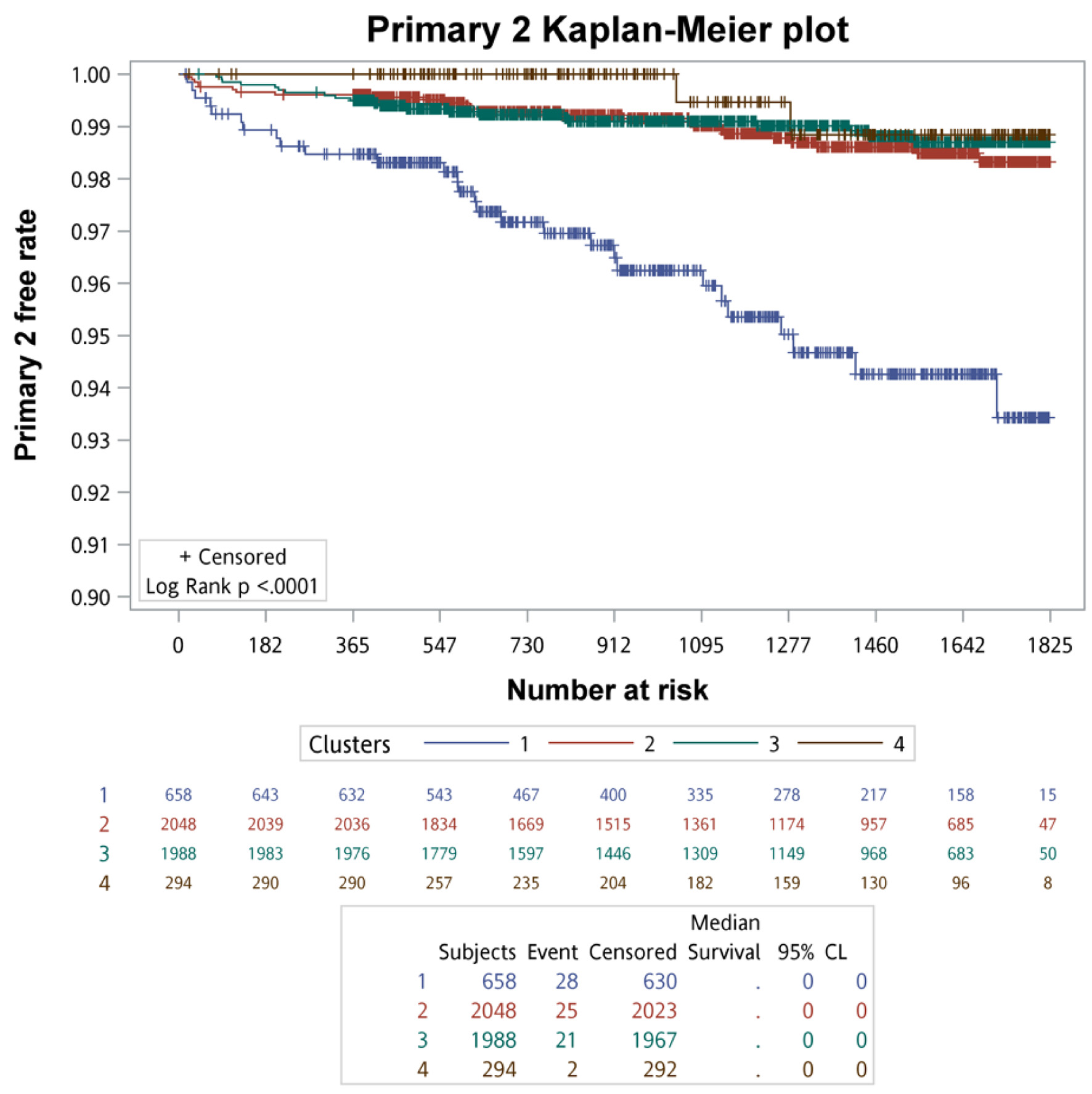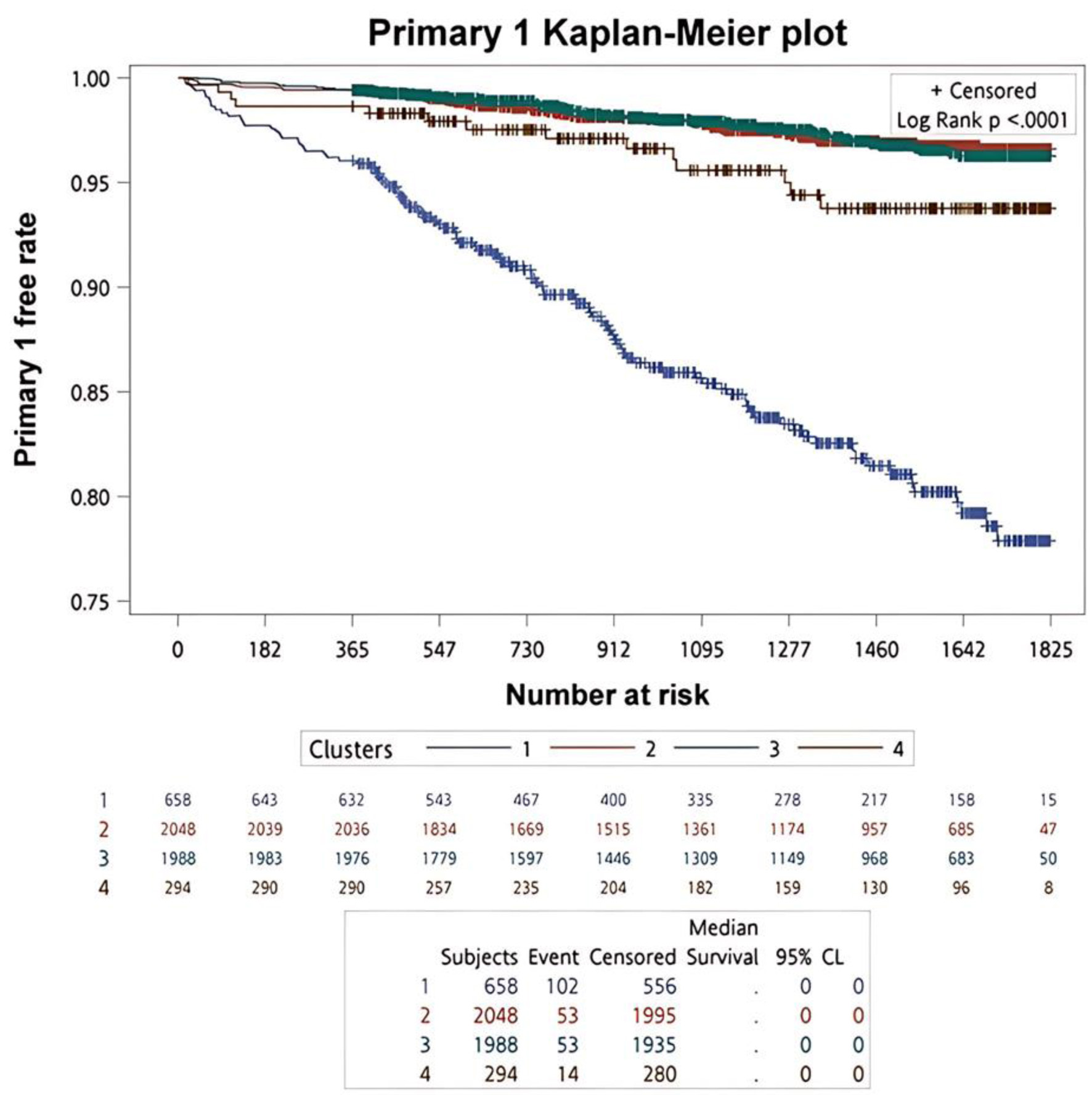 ![]() Click for large image | Figure 3. The survival analysis of the primary outcomes for each cluster. |