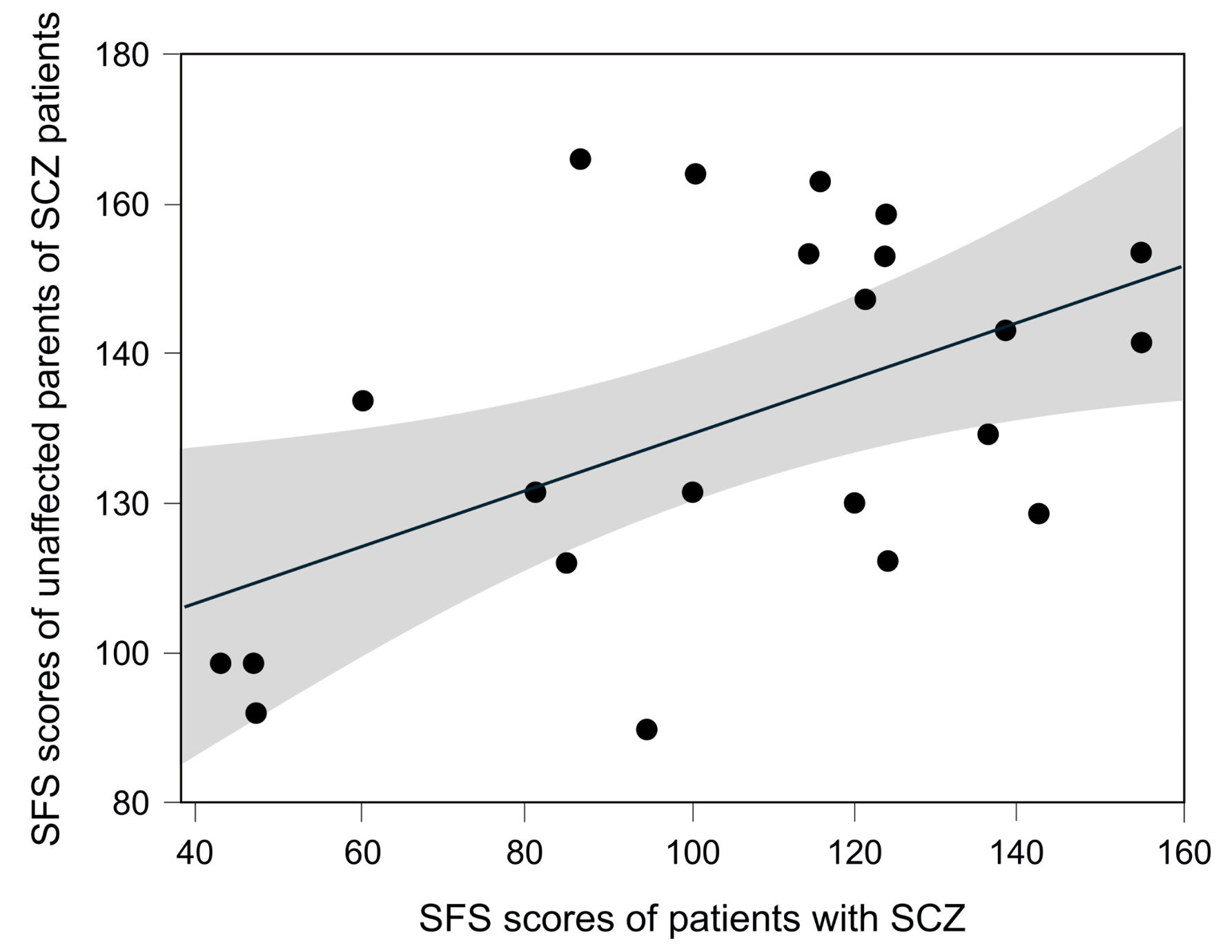 There were 22 pairs with SFS data for both the patients with SCZ and their unaffected parent. The results showed a tendency for correlation between the SFS scores of patients with SCZ and their unaffected parents, but it was not statistically significant (Spearman rank correlation coefficient: 0.3963, P = 0.0679) (Fig. 4).