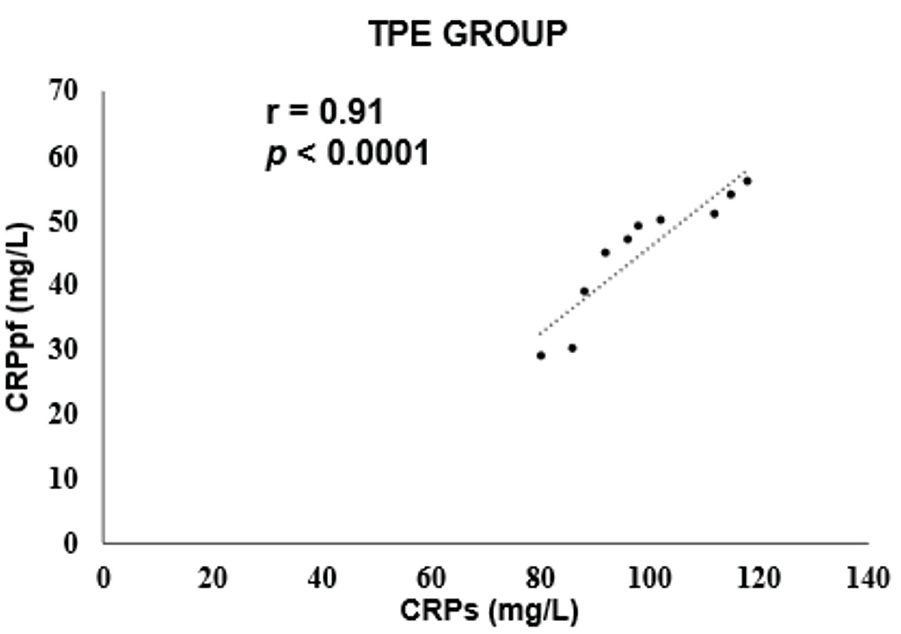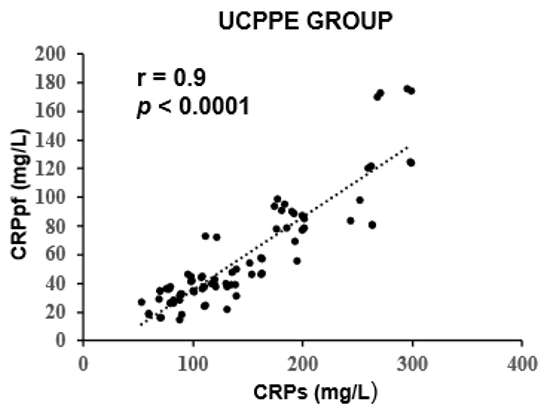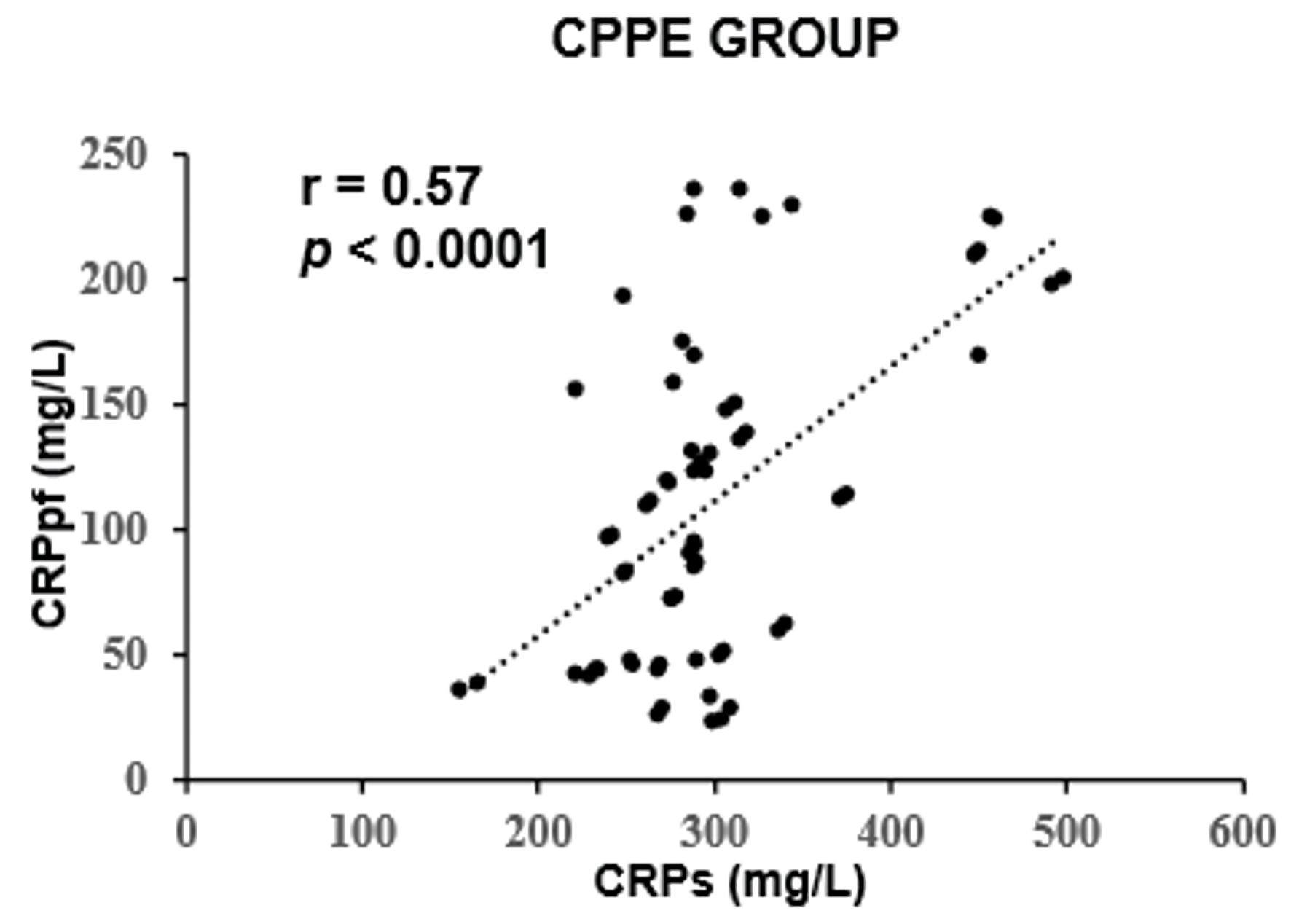 Results: Mean CRPs and CRPpf levels, respectively, were as follows: TrPE (11.3 ± 5.7 mg/L; 4.6 ± 2.8 mg/L), UCPPE (145.3 ± 67.6 mg/L; 58.5 ± 38.5 mg/L), CPPE (302.2 ± 75.6 mg/L; 112 ± 65 mg/L), MPE (56.1 ± 39.5 mg/L; 18.9 ± 13.9 mg/L), and TPE (98.7 ± 12.9 mg/L; 45.0 ± 9.4 mg/L). A statistically significant positive correlation between CRPpf and CRPs was observed in all groups: TrPE (r = 0.81, P < 0.0001), UCPPE (r = 0.90, P < 0.0001), CPPE (r = 0.57, P < 0.0001), MPE (r = 0.81, P < 0.0001), and TPE (r = 0.91, P < 0.0001). The correlation was significantly stronger in the UCPPE and TPE groups compared to the others, while the CPPE group showed the weakest correlation. Correlation strength in the TrPE and MPE groups was intermediate, but significantly greater than that in CPPE.
