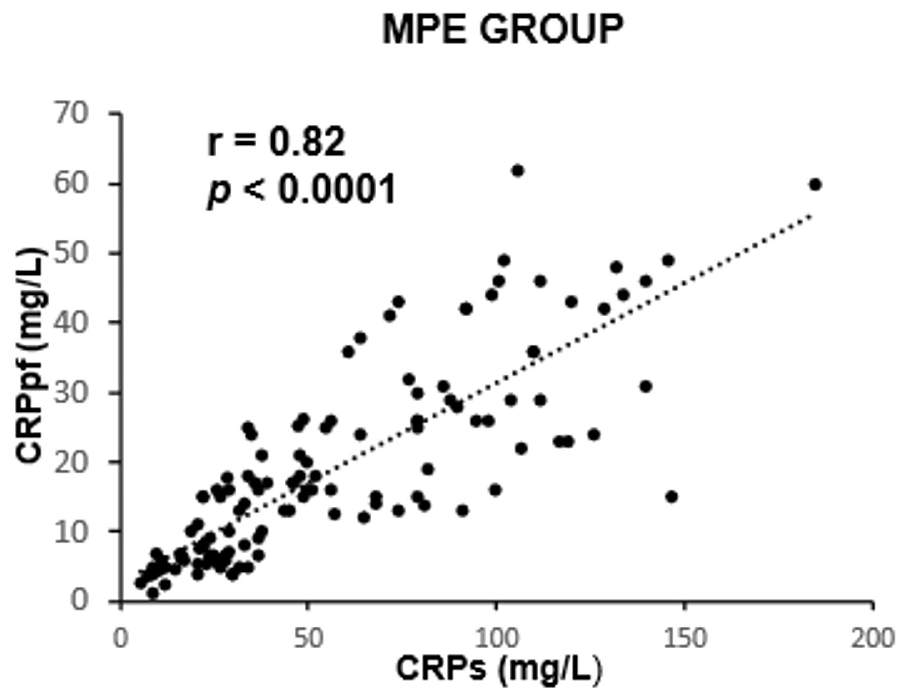 This retrospective study aimed to evaluate the correlation between CRPpf and CRPs levels in patients with PE of varying etiologies. To the best of our knowledge, this is the first study to compare the strength of this correlation across different diagnostic groups.
