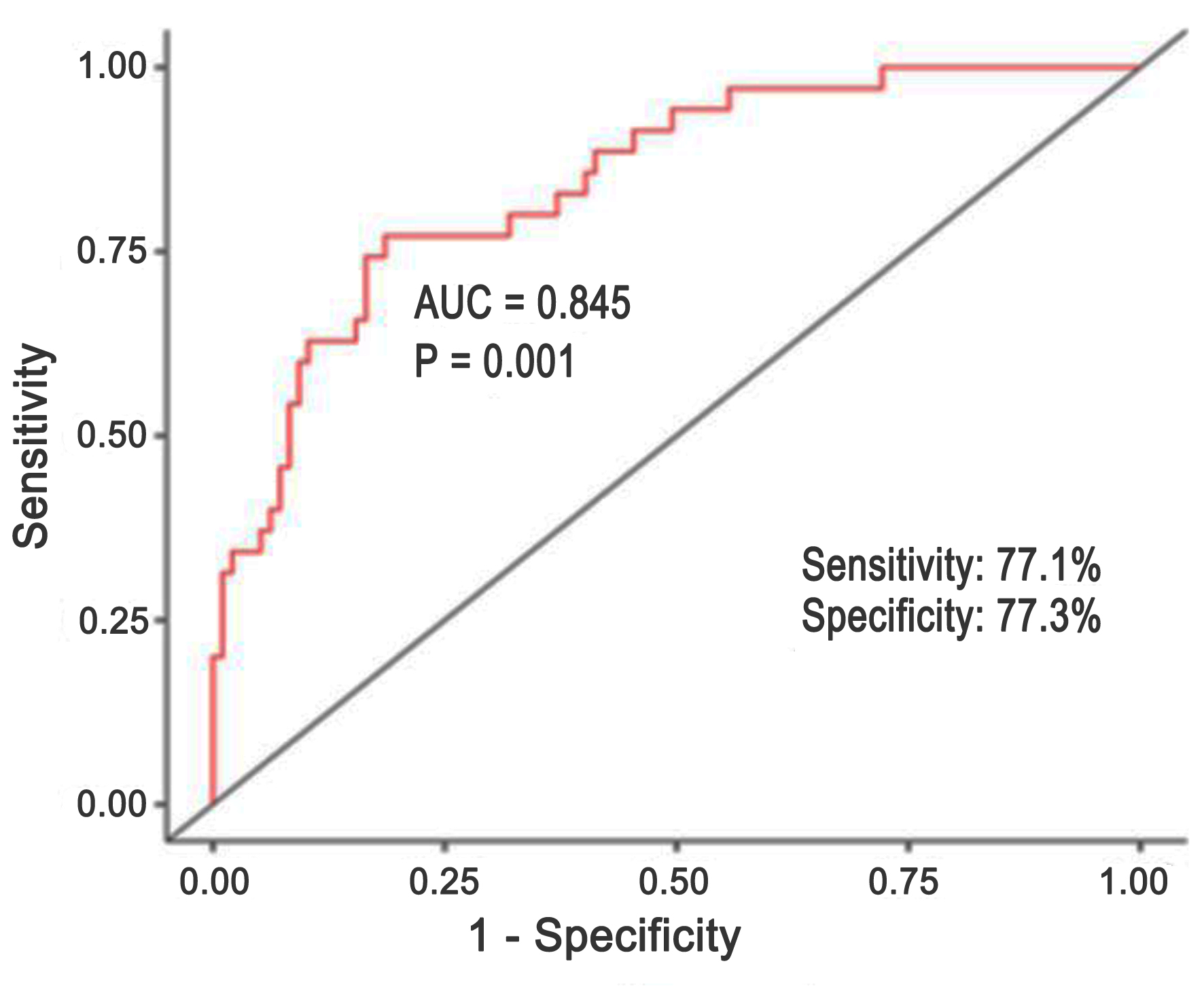 Our model’s AUC was 0.845. The model we developed is 77.1% sensitive, 77.3% specific, and 77.3% diagnostically efficient.